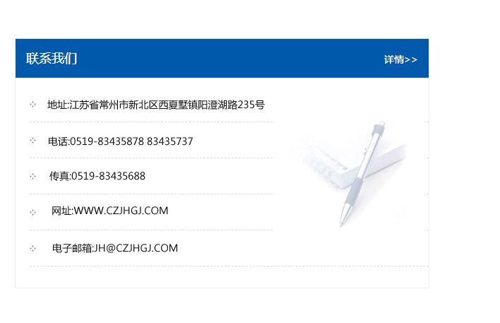 地址:常州市新北區友邦商務大廈1幢16、17層  電話:0519-85101652  傳真:0519-85112595  郵編:213022  網址:www.cz-jiayue_cn.bim51.com  郵箱:xiajifengaa@163.com